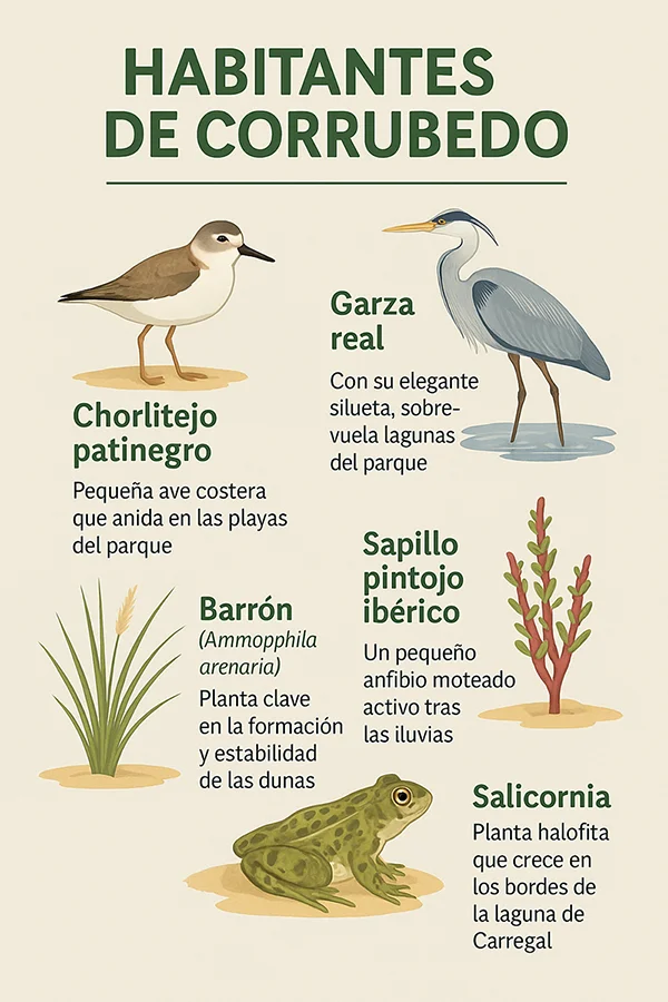 El Parque Natural de Corrubedo es un refugio para la biodiversidad costera. En él habitan especies que no solo dan vida al paisaje, sino que también cumplen funciones ecológicas esenciales. El chorlitejo patinegro anida en la arena, casi invisible entre las dunas. La majestuosa garza imperial sobrevuela las lagunas poco profundas en busca de peces. El barrón, una planta resistente al viento, fija la arena y da forma a las dunas. La salicornia tiñe de verde y rojo los suelos salinos, mientras que el sapillo pintojo ibérico asoma tras las lluvias en zonas húmedas. Juntos, forman parte del delicado equilibrio que define a Corrubedo.