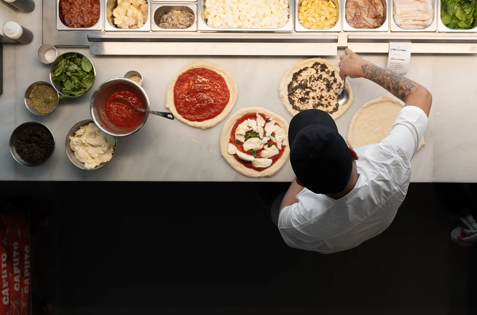 Matteo (chef de Grupo Tragaluz) lo explica con pasión: «El secreto está en la hidratación de la masa y en un proceso de fermentación mínimo de 48 horas. Esa espera le da ligereza, aroma y un sabor inconfundible». Pero el tiempo no lo es todo. La calidad de los ingredientes es otra de las claves. Muchos de los productos viajan directamente desde Italia hasta el corazón de Madrid: tomates, mozzarella, harinas seleccionadas.