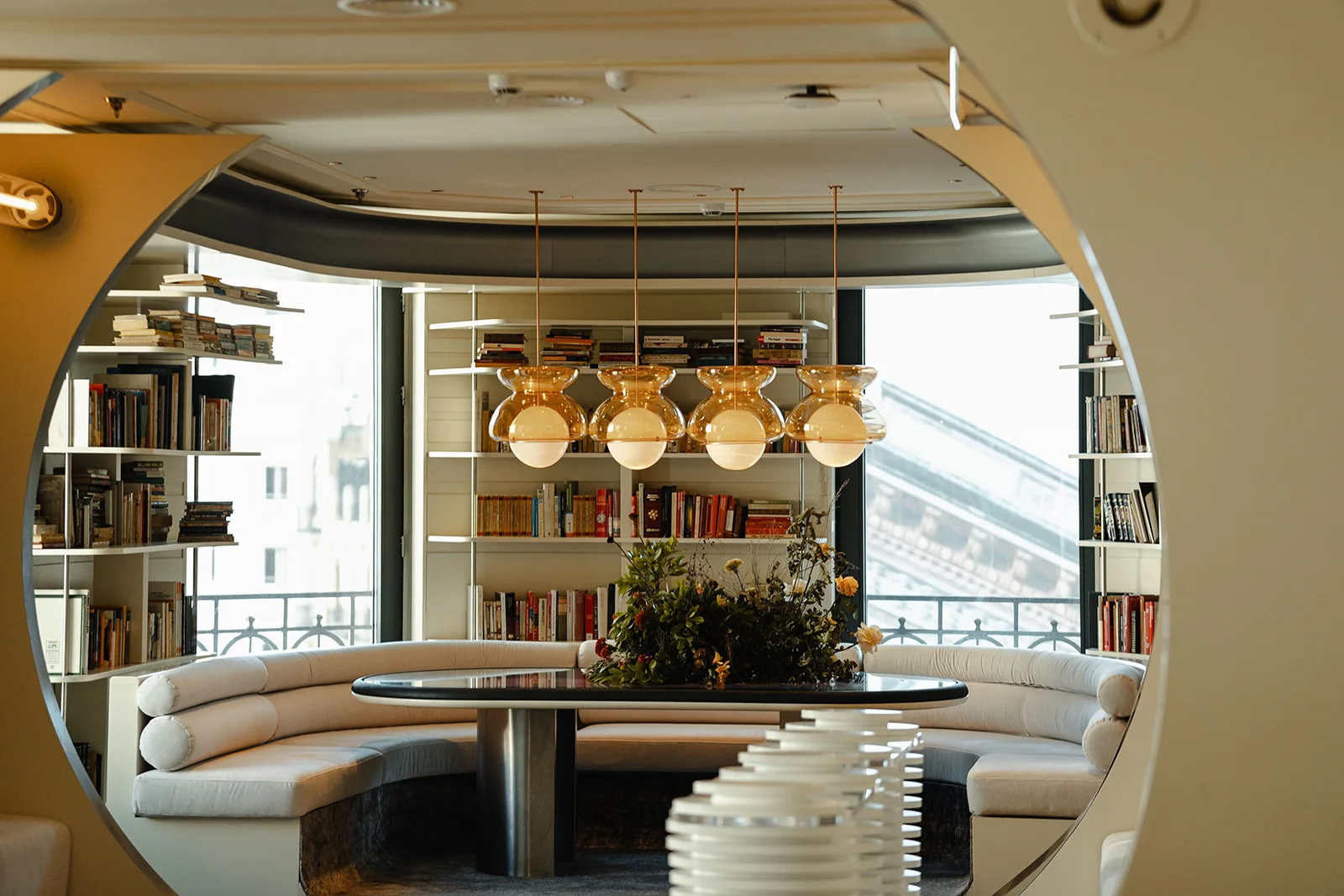 Gran Vía 18 cuenta con dos espacios muy diferenciados. Su restaurante interior, emplazado en la planta quinta, es una fantasía retro futurista que nos traslada a la estética d ellos años 70. El quinto piso evoca un salón-comedor lleno de sofás curvos, sillas de diseño, librerías abarrotadas de libros, un antiguo estudio de grabación lleno de vinilos y aparatos de sonido de décadas pasadas.
